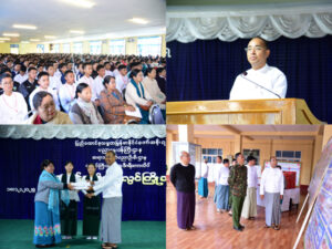 ဦးစွာ ရှမ်းပြည်နယ်ဝန်ကြီးချုပ်ဦးအောင်အောင် က နိုင်ငံသူနိုင်ငံသားများ၏ အသိပညာ၊ အတတ်ပညာများ တိုးတက်လာစေရေး၊ ပညာရည်မြင့်မားလာစေရေး စသည့် ပညာရေးလောက အကျိုးကို ဆောင်ရွက်ရာတွင် ဆရာ၊ဆရာမများ၏ အသိပညာအတတ်ပညာသည် အရေးပါသည့် အခန်းကဏ္ဍတစ်ခုအနေဖြင့် ရပ်တည်နေပါကြောင်း၊ လောကကို ပညာဖြင့်အလှဆင်နေကြသူများဖြစ်သည့် ဆရာ၊ဆရာမများက မိမိတို့၏ ပညာရေးလောကဝန်းကျင်တွင် အများကောင်းကျိုးအတွက် ထမ်းရွက်ရင်း မိမိအရည်အသွေးကိုလည်း အစဥ်အမြဲမြင့်တင်ပြီး ပညာရေးနှင့်ပတ်သက်သည့် ဝမ်းစာများပြည့်ဝနေရန် ကြိုးစားကြရမှာဖြစ်ကြောင်း၊ မောင်တို့၊မယ်တို့အနေဖြင့် နှလုံးရည်နှင့်ပညာရည်တို့ ဟန်ချက်ညီမျှနေစေရန် ပညာရေးဒီဂရိကောလိပ်တွင် တက်ရောက်မည့်(၄) နှစ်တာသင်တန်းကာလအတွင်း ကလေးသူငယ်များအတွက် သင်ကြားသင်ယူမှုဆိုင်ရာ နည်းနာများကို ကြိုးစားသင်ယူကြရမှာဖြစ်ကြောင်း၊ မိမိအရည်အချင်းကို ပြသခွင့်၊ ဖော်ထုတ်ခွင့်၊ ထုတ်ဖော်အသုံးချခွင့်၊ ပညာရေးဆိုင်ရာလုပ်ငန်းများတွင် ပါဝင်ခေါင်းဆောင်ခွင့်များရရှိရန်၊ မိမိပတ်ဝန်းကျင်မှလူအများနှင့်သဟဇာ တဖြစ်အောင်ကြိုးစားနေထိုင်တတ်စေရန်၊ အကောင်းဖက်သို့ Positive Thinking ဖြင့် ရှေးရှုမျှော်တွေးတတ်ပြီး မိမိ၏ပညာ့ ပတ်ဝန်းကျင်တွင် အသုံးဝင် လိုအပ်သော အဖိုးတန်လူသားတစ်ဦးဖြစ်လာစေရန်၊ မိမိတို့၏ မျိုးဆက်သစ်များကို အကောင်းဆုံး အတော်ဆုံး ပညာပြည့်ဝလူသားပီသသူများဖြစ်လာစေရန် ပုံသွင်းပြုပြင်သင်ကြားပြသပြီး ပညာအမွေကို လက်ဆင့်ကမ်းပေးကြရန်ပြောကြားသည်။