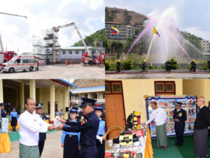 ထို့နောက် ရှာဖွေကယ်ဆယ်ရေးနှင့် မီးငြှိမ်းသတ်ရေး စွမ်းရည်သရုပ်ပြသရာ ကြိုးကူးနည်းများ သရုပ်ပြသခြင်း၊ ကြိုးဆင်းနည်း၊ ဂတ်(စ်)အိုးမီးလောင်မှုအား အအေးပေးစနစ်ဖြင့် မီးငြှိမ်းသတ်ခြင်း၊ အထပ်မြင့်မီးလောင်မှု သရုပ်ပြသခြင်း၊ ဆေးရောင်စုံရေထည့်ပြီး စွမ်းရည်ပြသကြပြီး ပြည်နယ်ဝန်ကြီးချုပ် ဦးအောင်အောင်က မီးသတ်တပ်ဖွဲ့နှင့် ဘင်ခရာတပ်ဖွဲ့တို့အား ဂုဏ်ပြုချီးမြှင့်ငွေပေးအပ်ရာ ပြည်နယ်မီးသတ်တပ်ဖွဲ့မှူးနှင့် ဘခင်ရာတပ်ဖွဲ့တို့မှ အသီးသီးလက်ခံရယူကြပြီး ပြည်နယ်ဝန်ကြီးချုပ်က လမ်းညွှန်အမှာစကားပြောကြား၍ ခင်းကျင်းပြသထားသော မီးငြှိမ်းသတ်ရေးနှင့် ရှာဖွေကယ်ဆယ်ရေးပစ္စည်းကိရိယာများကို ကြည့်ရှုကြကြောင်းသိရှိရသည်။