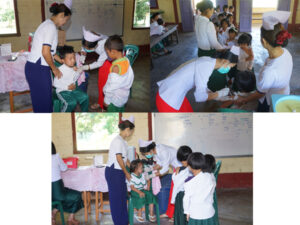 ထိုသို့ထိုးနှံရာတွင် မြို့နယ်ပြည်သူ့ကျန်းမာရေးဦးစီးဌာနမှ ကျန်းမာရေးဝန်ထမ်းများက အသက် ၉ နှစ်မှ ၁၀ နှစ် အရွယ် ကျောင်းသူလေးများကို ကျန်းမာရေးစစ်ဆေးပေးခြင်းများ ဆောင်ရွက်ပေး ပြီး သားအိမ်ခေါင်း ကင်ဆာရောဂါကာကွယ်ဆေး ထိုးနှံပေးသည်။ ထို့နောက် ကျန်းမာရေးဝန်ထမ်းများ က သားအိမ်ခေါင်း ကင်ဆာ၏ ရောဂါလက္ခဏာများ၊ သားအိမ်ခေါင်းကင်ဆာဖြစ်ပွားပါက နောက်ဆက် တွဲ ဖြစ်ပွားနိုင်သည့် ရောဂါလက္ခဏာများ၊ HPV ပိုးကူးစက်ခံရပြီး သားအိမ်ခေါင်းကင်ဆာ ဖြစ်ပွားနိုင်သည့် အချိန်ကာလများနှင့် HPV ကာကွယ်ဆေးသည် ဘေးကင်းစိတ်ချရသည့် ကာကွယ် ဆေးဖြစ်ပြီး HPV ရောဂါပိုးကြောင့် ဖြစ်ပွားနိုင်သည့် ကင်ဆာရောဂါများကို ထိထိရောက်ရောက် ကာကွယ်နိုင်ကြောင်းကို အသိပညာပေးဟောပြောခဲ့ပြီး အသက်ငါးနှစ်ပြည့်ပြီး ခုနစ်နှစ်မကျော်သော KG ကျောင်းသား၊ ကျောင်းသူများအား ဆုံဆို့မေးခိုင်ရောဂါ ကာကွယ်ဆေး(DT) ထိုးနှံပေးခဲ့ကြောင်း သိရသည်။ ဟိုပုံးမြို့နယ်၌ ကျောင်းအခြေပြု ဆုံဆို့မေးခိုင်ရောဂါ ကာကွယ်ဆေးကို ကျောင်းသား၊ ကျောင်းသူ (၁၁၀) ဦးနှင့် သားအိမ်ခေါင်းကင်ဆာ ရောဂါကာကွယ်ဆေးကို ကျောင်းသူ (၅၆) ဦးတို့အား ထိုးနှံပေးခဲ့ကြောင်းသိရသည်။