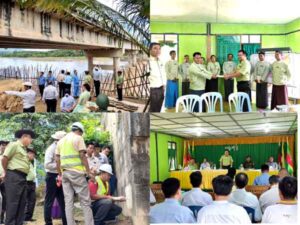 ပြည်နယ်အစိုးရအုပ်ချုပ်ရေးအဖွဲ့ခွဲ(ရှမ်းအရှေ့) ဥက္ကဌ ဦးတင်လင်း ဦးဆောင်၍ စက်တင်ဘာလ ၃ ရက် နံနက် ၇ နာရီတွင် သက်ဆိုင်ရာဌာနဆိုင်ရာများလိုက်ပါလျက် ကျိုင်းတုံမြို့မှ မိုင်းယောင်းခရိုင်၊ မိုင်းယောင်းမြို့သို့ ထွက်ခွာလာရာ ၀၉:၃၀အချိန်တွင် မိုင်းဖြတ်-မိုင်းယောင်းလမ်း (31.00-31.50)km ရှိ ၂၃-၆-၂၀၂၅ရက်နေ့တွင် မိုးအဆက်မပြတ်ရွာသွန်းမှုကြောင့် မြေသားတာဘောင်(၅၀’x၁၀’x၂၅’)ခန့်၊ ကတ္တရာလမ်းသား(၂၀’x၆’x၂၅’)ခန့် လမ်းသားပဲ့ကျမှုဖြစ်ပွားသည့်နေရာအား မူလလမ်းတာဘောင် အကျယ်ရရှိစေရေးအတွက် ယာယီအစီအစဉ်အရ မျောတုတ်ရိုက်ခြင်း၊ မြေဖို့ခြင်းနှင့် ကျောက်ကြီးဖြည့်ခင်းခြင်း ဆောင်ရွက်ထားရှိမှုအခြေအနေအား မြေပြင်ကွင်းဆင်းကြည့်ရှုစစ်ဆေးခြင်းဆောင်ရွက်ခဲ့ပြီး ကျိုင်းတုံမြို့မှ မိုင်းယောင်းခရိုင်၊ မိုင်းယောင်းမြို့သို့ ထွက်ခွာလာရာ နံနက် ၁၀ နာရီခွဲတွင် မိုင်းယောင်းခရိုင်ထွေ/အုပ်ရုံးသို့ရောက်ရှိခဲ့ပြီး ခရိုင်ထွေ/အုပ်ရုံး၊ ခေတ္တခရိုင်အုပ်ချုပ်ရေးမှူးရုံးခန်း၌ အစည်းအဝေးကျင်းပပြုလုပ်ခဲ့ရာ အခမ်းအနားသို့ ခရိုင်/မြို့နယ် စီမံခန့်ခွဲရေးနှင့် အုပ်ချုပ်ရေးကော်မတီဥက္ကဌများနှင့် အဖွဲ့ဝင်များ၊ ခရိုင်/မြို့နယ်အဆင့် ဌာနဆိုင်ရာများ တက်ရောက်ခဲ့ကြပြီး အခမ်းအနားတွင် ပြည်နယ်အစိုးရအုပ်ချုပ်ရေးအဖွဲ့ခွဲ(ရှမ်းအရှေ့) ဥက္ကဌ ဦးတင်လင်းက အဖွင့်အမှာစကားပြောကြားပြီးနောက် တက်ရောက်လာသည့် တာဝန်ရှိသူများ၏ တင်ပြချက်များအပေါ် ဥက္ကဌ ဦးတင်လင်းက လိုအပ်သည်များ ပေါင်းစပ်ညှိနှိုင်း ဆောင်ရွက်ပေးခဲ့ပါကြောင်း သိရှိရသည်။