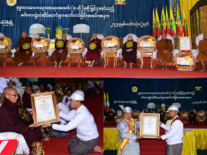 ဆက်လက်၍ နိုင်ငံတော်သံဃမဟာနာယကအဖွဲ့ အဖွဲ့ဝင်တောင်ကြီးမြို့ ကံသာရပ်ကွက် မဟာဓမ္မိကာရာမကျောင်းတိုက်၊ ဦးစီးပဓာနနာယက ဆရာတော်အဂ္ဂမဟာ ဂန္တဝါစကပဏ္ဍိတ၊ အဂ္ဂမဟာသဒ္ဓမ္မဇောတိကဓဇ၊ မဟာမင်္ဂလ ဓမ္မဇော်တိကဓဇ၊ ဘဒ္ဒန္တဓမ္မာနန္ဒာဘိဝံသက သြဝါဒကထာမြွက်ကြားချီးမြှင့်ပေးသည်။