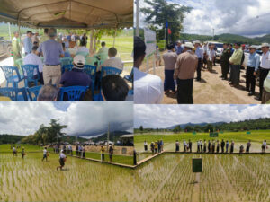 မိုင်းတုံမြို့၊ မြို့မကျွေးရွာအုပ်စု၊ ကွင်းအမှတ်(၃)စံပြကွက်များတွင် စိုက်ပျိုးရေးဦးစီးဌာနမှ ဒေသခံစိုက်ပျိုးတောင်သူများသိရှိစေရန် သက်တမ်း(၁၃၅)ရက်ရှိသော စပါးမျိုးကို နမူနာပြု၍ မြေသြဇာထည့်သွင်းချိန်ပြသောပုံ ဗွီနိုင်းဖြင့် စိုက်ထူပြသထားရှိပြီး မြေသြဇာကြဲပတ်ပွဲအခမ်းအနားသို့ ဩဂုတ်လ( ၁၇) ရက် နေ့လည် ( ၁၂ ) နာရီခွဲတွင် ပြည်နယ်အစိုးရအုပ်ချုပ်ရေးအဖွဲ့ခွဲ ( ရှမ်းအရှေ့ )၊ ဥက္ကဌ၊ ဦးဇော်လွင်ဦး သည် ရှမ်းပြည်နယ်အစိုးအဖွဲ့၊ ရှမ်းပြည်နယ်ဝန်ကြီးချုပ်နှင့် အဖွဲ့ဝင်များ၊ ဌာနဆိုင်ရာအကြီးအကဲများ၊ တာဝန်ရှိသူများ၊ ဒေသခံတောင်သူများနှင့်အတူတက်ရောက်ခဲ့ကြပြီး အခမ်းအနားတွင် တွဲဖက်ပြည်နယ်စိုက်ပျိုးရေးဦးစီးဌာန(ကျိုင်းတုံ)ရုံး၊ ဦးစီးမှူးမှ လုပ်ငန်းဆိုင်ရာများအားရှင်းလင်းတင်ပြခြင်း၊ ပြည်နယ်ဝန်ကြီးချုပ်နှင့် အဖွဲ့ဝင်များမှ မြေသြဇာကြဲပတ်ခြင်းအား လိုက်လံကြည့်ရှုခြင်း၊ ပြည်နယ်ဝန်ကြီးချုပ်မှ ဒေသခံတောင်သူများ၏ တင်ပြချက်များအား ညှိနှိုင်းဆောင်ရွက်ပေးခြင်းများတွင် အတူလိုက်ပါဆောင်ရွက်ခဲ့ကြကြောင်း သိရှိရသည်။