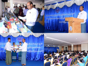 ဆက်လက်၍ စာပေပဒေသာဝေဆာစေမည်VideoClipပြသပြီး အလှူငွေနှင့်စာအုပ်စာစောင်များ ပေးအပ်လှူဒါန်းကြရာ ရှမ်းပြည်နယ်အစိုးရအဖွဲ့၊ဌာနဆိုင်ရာများ၊ အလှူရှင်များမှလှူဒါန်းသောစာအုပ်၊ အလှူငွေများတို့ကို ပြည်နယ်ဝန်ကြီးများ၊ ပြည်နယ် အစိုးရအဖွဲ့အတွင်းရေးမှူး၊ ပြည်နယ်အဆင့်ဌာနဆိုင်များမှ ပေးအပ်လှူဒါန်းကြရာ ရှမ်းပြည်နယ်ဝန်ကြီးချုပ် ဦးအောင်အောင်က လက်ခံရယူ၍ ဂုဏ်ပြုမှတ်တမ်းလွှာများ ပြန်လည်ပေးအပ်ပြီး ခန်းမအတွင်းခန်းကျင်းပြသထားသော စာအုပ်များနှင့်Community Centreတွင် အင်္ဂလိပ်စာသင်တန်းသားမှ သင်တန်းသား၊ သင်တန်းသူများမှ ရောင်စုံဆေးရေးခြယ်နေမှုကို ကြည့်ရှုအားပေး၍ ဂုဏ်ပြုလက်ဆောင်ပစ္စည်းများ ပေးအပ်ခဲ့ကြကြောင်း သိရှိရသည်။