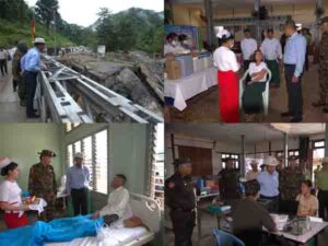 ယင်းနောက် ပြည်နယ်ဝန်ကြီးချုပ်နှင့်တာဝန်ရှိသူများသည် ကျောက်မဲမြို့၊ လာဘမုနိတရုတ်ဘုံ ကျောင်းတွင် ဖွင့်လှစ်ထားရှိသည့် ယာယီဆေးရုံသို့သွားရောက်၍ ဆေးကုသမှုခံယူနေကြသည့် ပြည်သူများအား အာဟာရဖြည့်ပစ္စည်းများပေးအပ်ကာ အားပေးစကားပြောကြားခဲ့သည်။