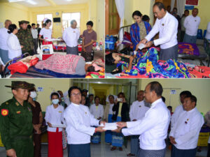 ရှမ်းပြည်နယ်(မြောက်ပိုင်း)၊ လားရှိုးမြို့တွင် ၂၀၂၄ခုနှစ်၊ ဇူလိုင်လတွင် အကြမ်းဖက်သောင်းကျန်းသူ MNDAA၊ TNLA အဖွဲ့မှ လက်နက်ကြီး၊ လက်နက်ငယ်များ၊ ရှော့တိုက်ဒုံးများ ပစ်ခတ်မှုကြောင့် မြို့တွင်းရှိလူနေအိမ်များ၊ ဘုန်းတော်ကြီးကျောင်းများပေါ်သို့ ကျရောက်ပေါ်ကွဲမှုဖြစ်ပွားခဲ့၍ ဒေသခံပြည်သူများ၊ သံဃာတော်များ လက်နက်ကြီး၊ ယမ်းစထိမှန်ထိခိုက်ဒဏ်ရာရရှိခဲ့သဖြင့် တောင်ကြီးမြို့၊ စဝ်စံထွန်းဆေးရုံတွင် ဆေးကုသမှုခံယူလျက်ရှိရာ သြဂုတ်(၂)ရက် နံနက်(၉)နာရီက ရှမ်းပြည်နယ်အစိုးရအဖွဲ့ ပြည်နယ်ဝန်ကြီးချုပ် ဦးအောင်အောင်၊ အရှေ့ပိုင်းတိုင်းစစ်ဌာနချုပ်၊ ဒုတိယတိုင်းမှူး၊ ပြည်နယ်ဝန်ကြီးများ၊ ပြည်နယ်ဥပဒေချုပ်နှင့် တာဝန်ရှိသူများက သွားရောက်ကြည့်ရှု အားပေး စကားပြောကြား၍ အထည်နှင့် ထောက်ပံ့ငွေများပေးအပ်ခဲ့ကြပြီး ပြည်နယ်ဝန်ကြီးချုပ် ဦးအောင်အောင်က စဝ်စံထွန်း ဆေးရုံအတွက် ထောက်ပံ့ငွေများပေးအပ်ရာ စဝ်စံထွန်ဆေးရုံအုပ်ကြီး ဒေါက်တာ ဝင်းမော်ဦးမှ လက်ခံရယူသည်။