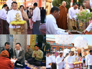 ထို့နောက် ဆရာတော်သံဃာတော် အရှင်သူမြတ်များထံက မေတ္တာသုတ် ပရိတ်တရားတော်များနာကြားခဲ့ပြီး အရှေ့မြောက်တိုင်းစစ်ဌာနချုပ် တိုင်းမှူးနှင့် တာဝန်ရှိသူများက လှူဖွယ်ဝတ္ထုအစုစုတို့အား ဆပ်ကပ်လှူဒါန်းကာ ဆရာတော်အရှင်သူမြတ်များထံမှ ဩဝါဒကထာ ခံယူ၍ လှူဖွယ်ဝတ္ထုအစုစုတို့အတွက် ရေစက်သွန်းချအမျှပေးဝေခဲ့သည်။