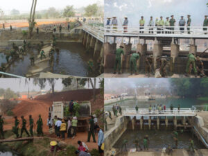 ထိုသို့ဆောင်ရွက်ရာတွင် ဟိုပုံးတပ်နယ်ကွပ်ကဲမှုအောက်ရှိ တပ်ရင်းတပ်ဖွဲ့များမှ အရာရှိ၊ စစ်သည်များ၊ မြို့နယ်အထွေထွေအုပ်ချုပ်ရေးဦးစီးဌာန၊ မြို့နယ်မီးသတ်ဦးစီးဌာန၊ မြန်မာနိုင်ငံရဲ တပ်ဖွဲ့၊ မြို့နယ်စည်ပင်သာယာရေးဌာန၊ ဒေသ/မြို့နယ်အဆင့် ဌာနဆိုင်ရာများက ရေကန် ပတ်ဝန်းကျင်ရှိ ခြုံနွယ်‌၊ ပေါင်းမြက်များကို ခုတ်ထွင်ရှင်းလင်းခြင်း၊ ရေကန်အတွင်းရှိ ရွံ့၊ နွံ့များဆယ်ယူခြင်း၊ ရေကန်ကိုလာရောက်အသုံးပြုသူများအဆင်ပြေစေရန် ရေချိုးရန်နေရာ သီးသန့် သတ်မှတ်ခြင်း၊ ရေစီးရေလာကောင်းမွန်စေရေးအတွက် ရေမြောင်းရှိ အမှိုက်များရှင်းလင်း ခြင်းတို့ကို စုပေါင်းဆောင်ရွက်ကြသည်။