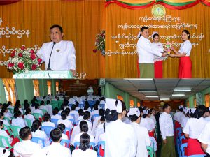 ထို့နောက် တောင်ကြီးမြို့ သူနာပြုသင်တန်းကျောင်း၊ ကျောင်းအုပ်ကြီး ဒေါ်စုဝေမာမှ ဂျူတီကုတ်နှင့် ဦးဆောင်းအပ်နှင်းခြင်း အကြောင်းစပ်လျဥ်း၍ ရှင်းလင်းပြောကြားပြီး ပညာရည်ချွန်ဆုများ ပေးအပ်ချီးမြှင့်ရာ ပထမ၊ဒုတိယ၊တတိယဆုရရှိသူများကို ရှမ်းပြည်နယ်ဝန်ကြီးချုပ် ဦးအောင်ဇော်အေးက ပေးအပ်ရာ ဆုရရှိသော သင်တန်းသူများမှ လက်ခံရယူကြသည်။